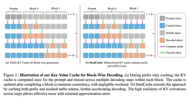 KV 缓存通过将序列划分为块(Blocks),预计算并存储其他块的激活值(KV Activations),在后续解码中重复利用,显著减少计算冗余。其 DualCache 版本进一步缓存前后缀词元(Prefix and Suffix Tokens),利用相邻推理步骤的高相似性提升效率。