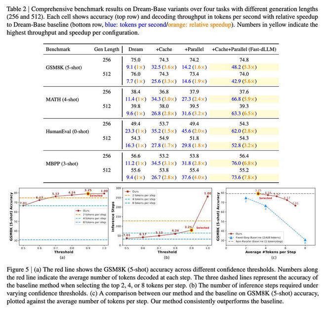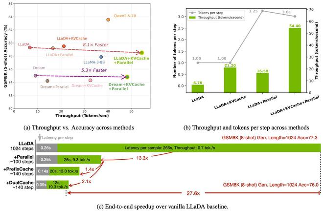 Fast-dLLM 在多项基准测试中展现了惊人表现。在 GSM8K 数据集上,生成长度为 1024 词元时,其 8-shot 配置下实现了 27.6 倍加速,准确率达 76.0%;在 MATH 基准测试中,加速倍数为 6.5 倍,准确率约为 39.3%;在 HumanEval 和 MBPP 测试中,分别实现了 3.2 倍和 7.8 倍加速,准确率维持在 54.3% 和基线水平附近。