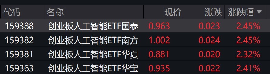 受盘面影响,跟踪创业板人工智能指数的ETF涨超2%。