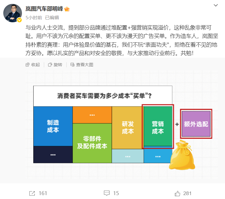 6月4日,岚图汽车CBO、销售公司总经理邵明峰在社交平台痛批“堆配置+强营销”这一行业溢价潜规则,称“用户不该为冗余的配置买单、更不该为漫天的广告买单”,并表示作为造车人,岚图坚持朴素的真理:用户体验是价值的基石,我们不玩“表面功夫”,拒绝在看不见的地方妥协。