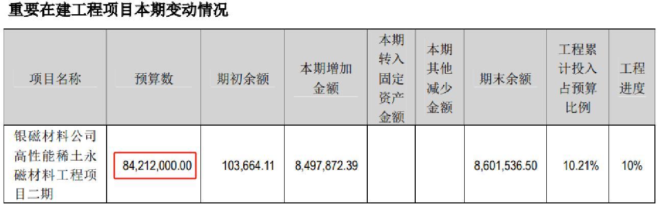 目前,公司有一个高性能稀土永磁材料工程项目正在建设中,这个项目的预计投资总额超过了8,400万元。