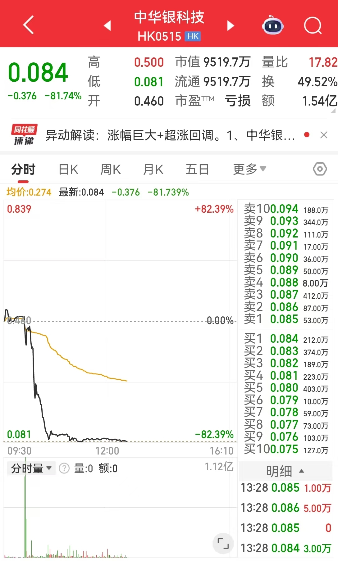 值得注意的是,中华银科技(HK0515)放量闪崩,截至发稿,中华银科技报0.084港元,跌幅81.74%。该股此前在不到一个月的时间里股价飙升超4倍。