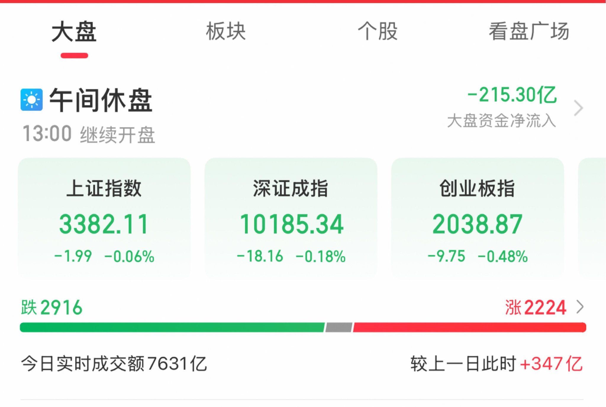 A股三大指数早盘集体下跌,截至午盘,沪指跌0.06%,深成指跌0.18%,创业板指跌0.48%,北证50指数跌0.11%。全市场半日成交额7631亿元,较上日放量347亿元。全市场超2900只个股下跌。