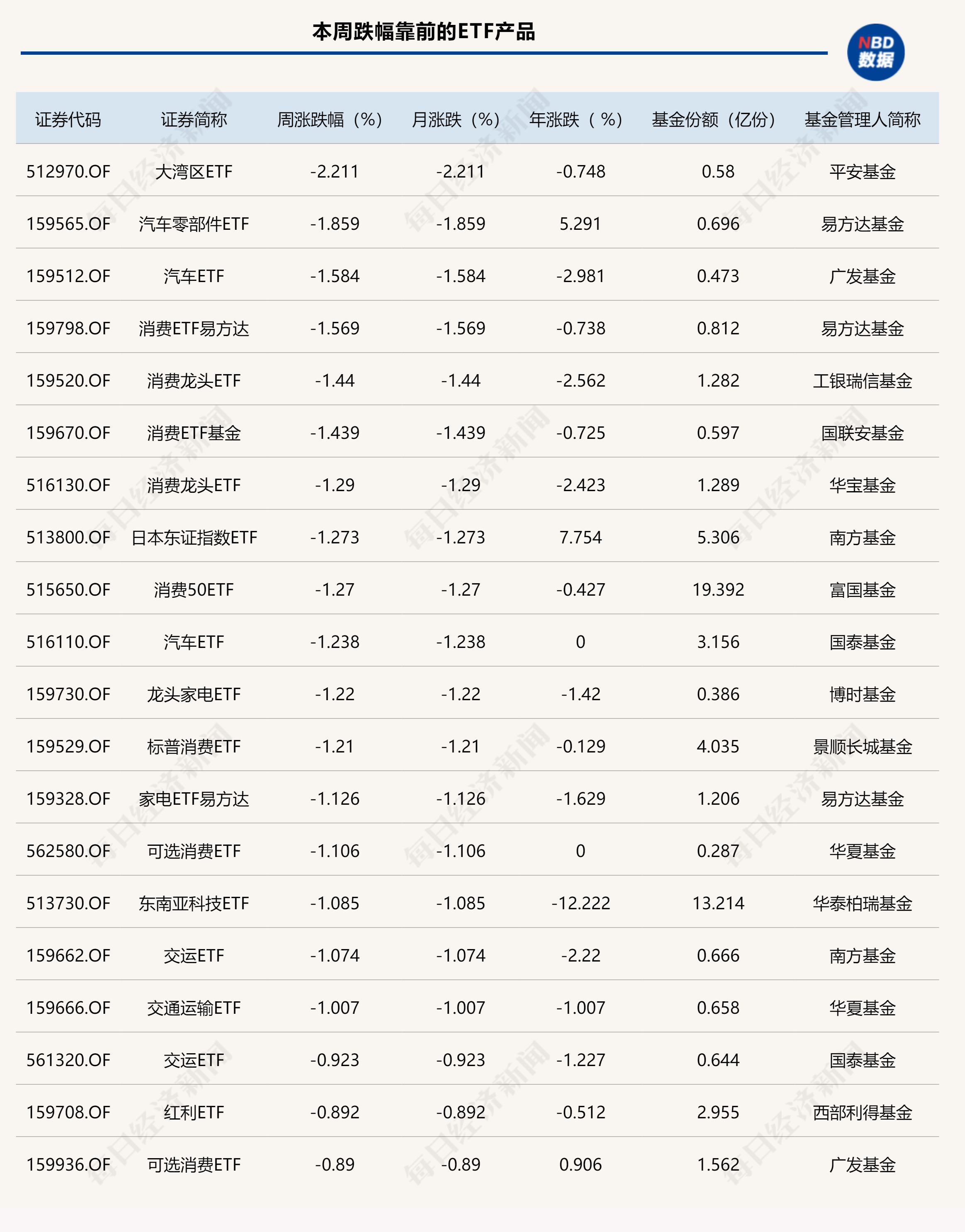 其他方面,汽车零部件ETF、汽车ETF、消费ETF易方达、消费龙头ETF,家电相关ETF周跌幅都超过1%。跨境ETF方面,日本东证指数ETF、东南亚科技ETF跌幅超过1%。