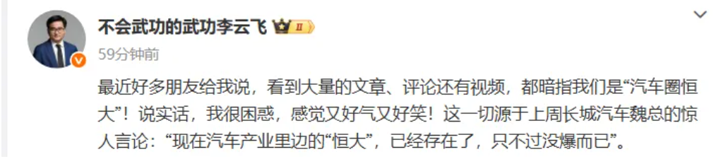 5月30日,比亚迪集团品牌及公关处总经理李云飞发文回应称,看到大量文章、评论、视频都暗指比亚迪是“汽车圈恒大”,这一切源于上周长城汽车魏总的惊人言论:“现在汽车产业里边的‘恒大’,已经存在了,只不过没爆而已。”