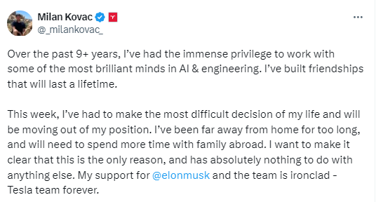 他写道:“我离家太久了,需要花更多的时间和国外的家人在一起。”科瓦奇声称,这是“唯一的原因,与其他任何事情都无关”,他对马斯克和特斯拉的支持是“坚不可摧的”。
