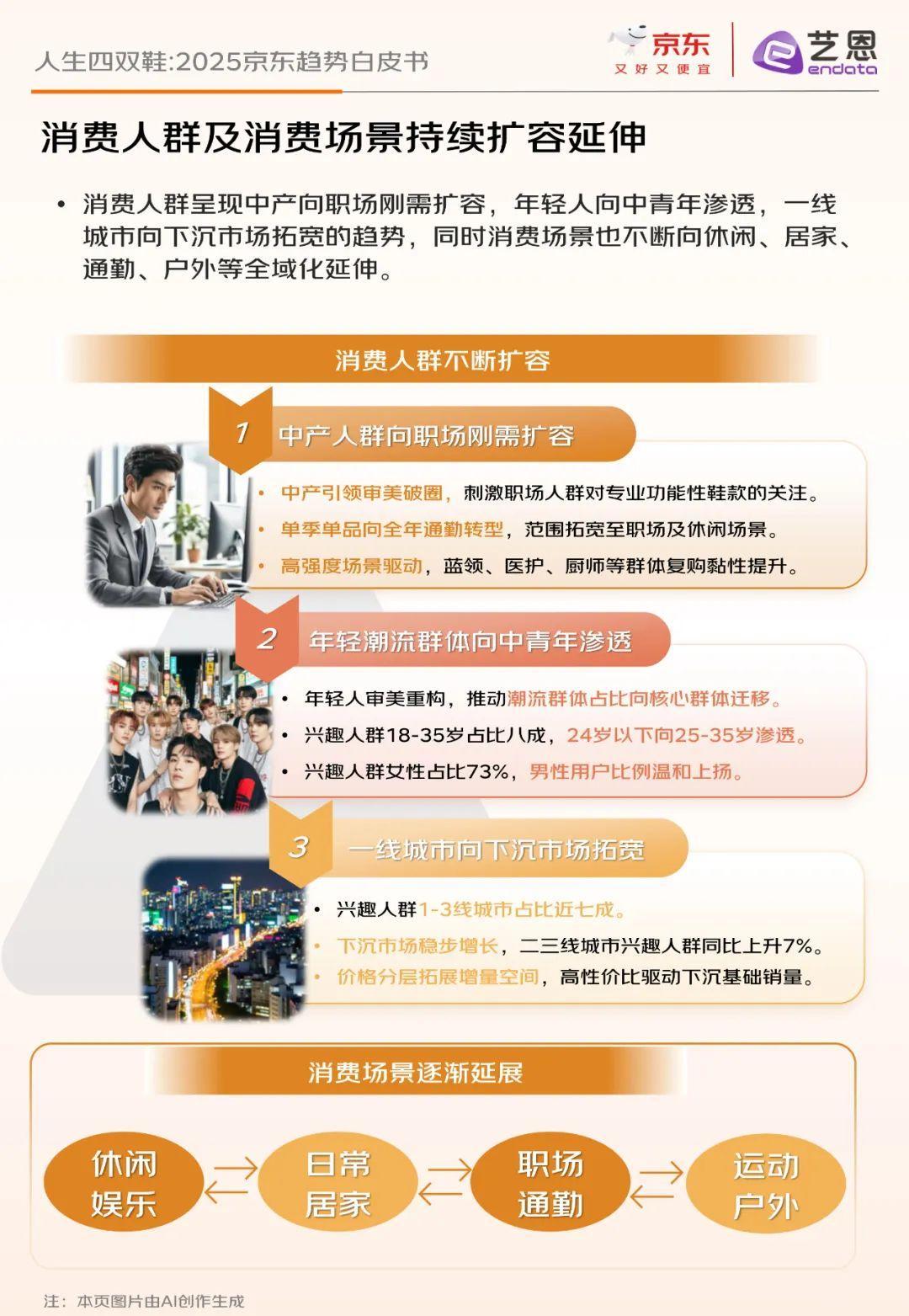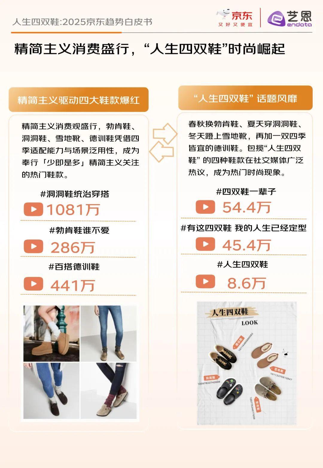 报告指出,精简主义消费观推动这四款鞋成为热门单品,它们凭借四季适配能力与场景泛用性,满足了消费者“少即是多”的理念。社交媒体上相关话题热度持续攀升,如“四双鞋一辈子”话题浏览量达54.4万。消费人群从年轻群体向中青年渗透,从一线城市向下沉市场拓宽,消费场景也从休闲、居家延伸至通勤、户外等全域化场景。