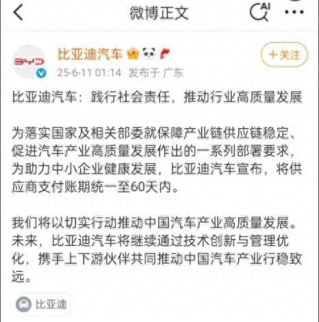 比亚迪汽车官微6月11日凌晨发布消息:为落实国家及相关部委就保障产业链供应链稳定、促进汽车产业高质量发展作出的一系列部署要求,为助力中小企业健康发展,比亚迪汽车宣布,将供应商支付账期统一至60天内。“我们将以切实行动推动中国汽车产业高质量发展。未来,比亚迪汽车将继续通过技术创新与管理优化,携手上下游伙伴共同推动中国汽车产业行稳致远。”