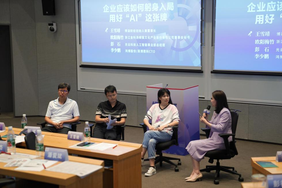 在圆桌讨论环节,博涵财经创始人兼董事长王雪靖作为嘉宾主持,与来自汤姆猫、光云科技、鸿博股份旗下的英博数科等企业代表共同探讨和分享了AI在各自领域的实践成果,展现了杭州作为数字经济中心的创新活力。
