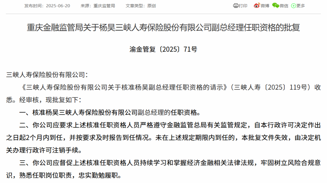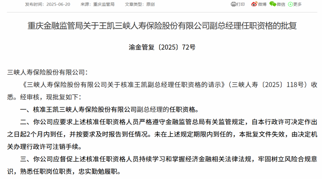 6月20日,国家金融监督管理总局重庆金融监管局发布两则批复,核准王凯、杨昊担任三峡人寿保险股份有限公司(以下简称“三峡人寿”)副总经理的任职资格。