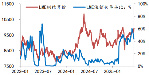 库存/消费比:2025年3月全球铜流向美国,COMEX库存大幅增加,LME、SHFE去库。LME铜注销仓单占比接近50%,现货转为升水。关税溢价套利贸易,扰动了全球铜正常的贸易格局,加剧了其他地区的供需矛盾。