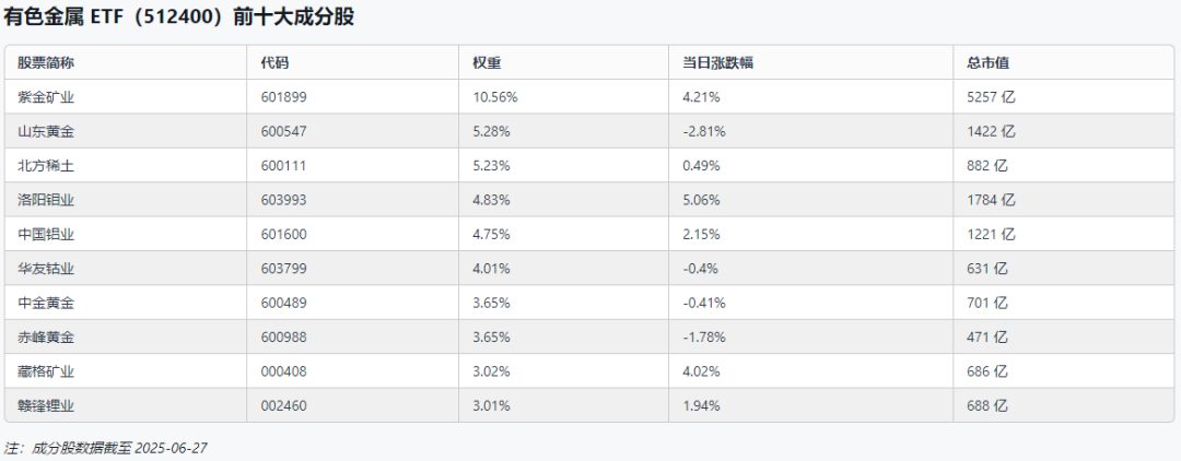 ETF 十大重仓个股中,紫金矿业、洛阳钼业和藏格矿业表现突出,当日涨幅分别为 4.21%、 5.06%和 4.02%;而山东黄金、赤峰黄金跌幅较大,分别下跌 2.81%和 1.78%。