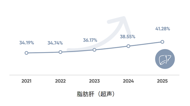 自2021年起,体重指数(BMI)增高、甲状腺结节(超声)、前列腺异常(超声)、脂肪肝(超声)、乳腺结节(超声)等五项指标异常检出率更是一路狂飙,连续5年呈现逐年上升的趋势。