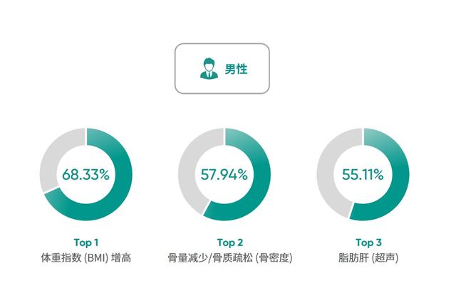 相比女性,北京市男性体检人群更容易发福,体重指数(BMI)增高是其覆盖最广泛的健康问题,检出率近七成,超出女性32.39%。肥胖是200多种疾病的危险信号③,针对肥胖问题国家已出手,启动了为期三年的“体重管理年”行动,建议北京爷们儿尽快将体重管理提上日程。