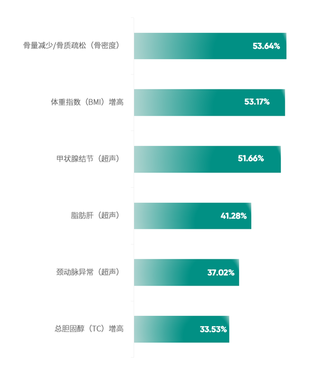 排除与性别相关的异常结果,体重指数(BMI)增高和甲状腺结节(超声)是潜藏在北京市体检人群中的另外两大“健康刺客”,均有超半数人“中招”。