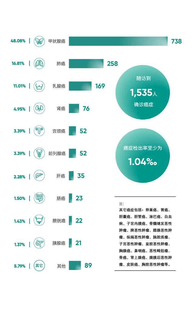 仅去年一年,在北京市近150万体检人群中,爱康集团已随访到1535人确诊癌症。也就是每1000位参加体检的北京居民中至少就有1人确诊癌症,其中随访到的甲状腺癌患者数高居TOP1,检出率高达48%,同样位于前列的是肺癌、乳腺癌等。随着癌症随访工作的持续进行,体检人群的癌症检出率会逐渐升高。以2024版《北京健康报告》为例,在癌症随访工作的持续推进下,截至2025年4月30日,上述体检人群中癌症检出率已经从1.04‰上升至2.30‰。