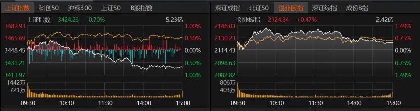 今日沪深两市分化明显,沪指收跌0.7%报3424.23点,创业板指收涨0.47%报2124.34点。