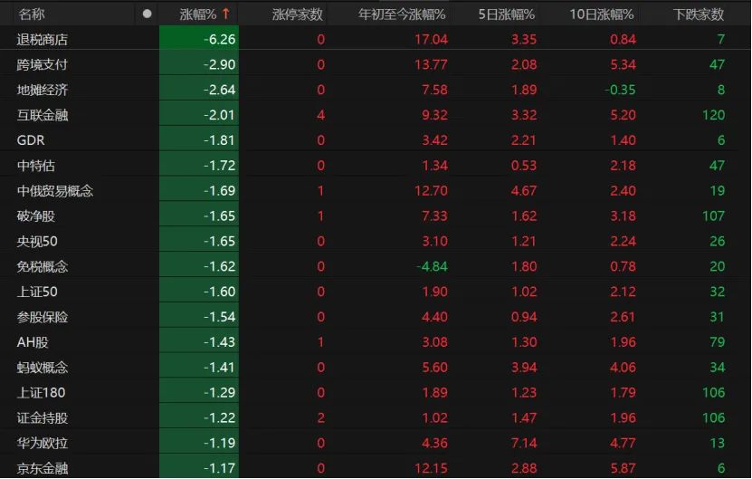但退税商店概念板块跌幅超过6%,跨境支付、地摊经济、互联金融跌幅均超过2%,GDR、中俄贸易概念、破净股等概念板块均收跌。