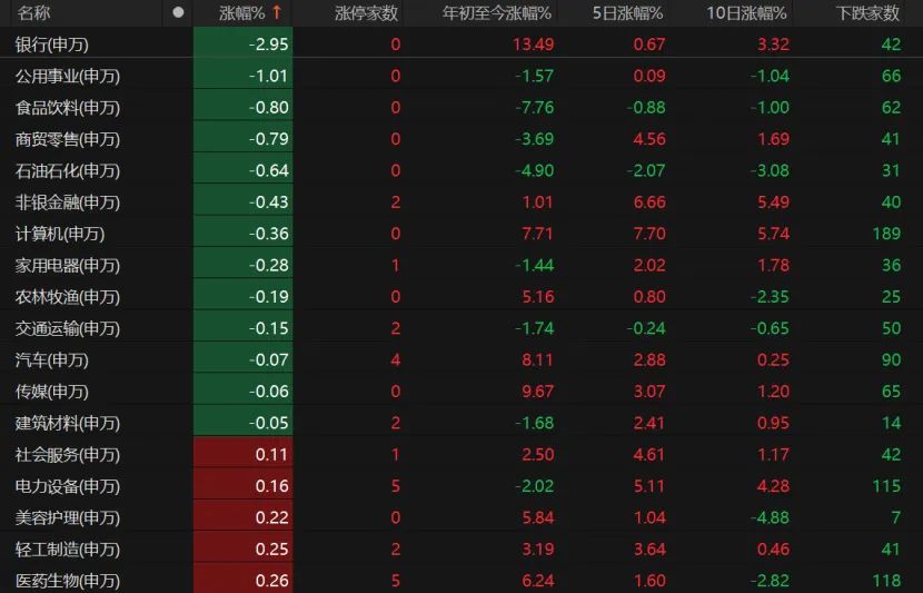 银行板块今日出现回落,跌近3%。公用事业、食品饮料、商贸零售板块均跌近1%。石油石化、非银金融板块微跌,但爱建集团、弘业期货涨停,天风证券涨近8%。