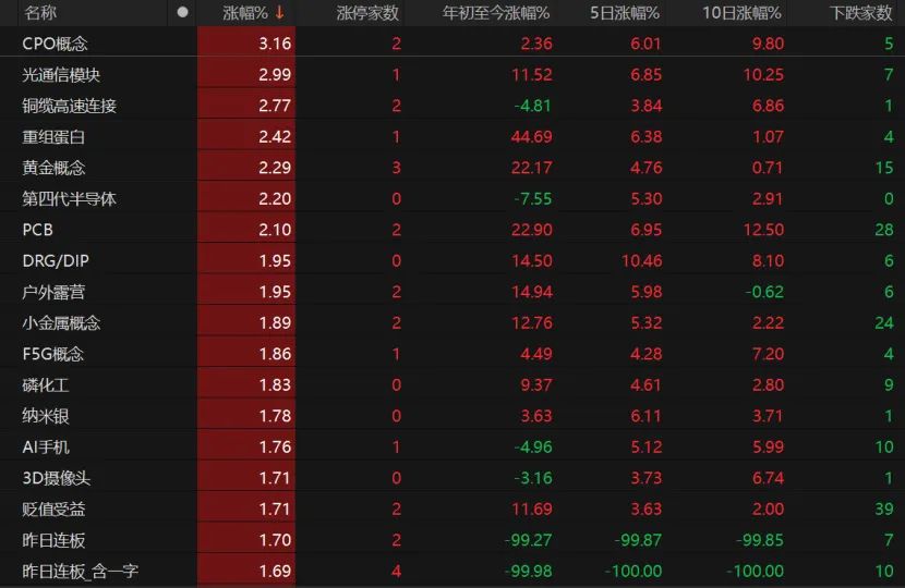 CPO概念涨逾3%,光通信模块、铜缆高速连接涨近3%,重组蛋白、黄金概念、第四代半导体等概念板块涨幅超过2%。