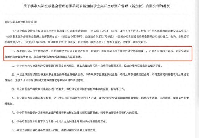 证监会表示,核准兴证全球以自有资金,在新加坡设立子公司,简称兴证全球新加坡,注册资本1000万新币,公司应当在批复下发之日起12个月内完成兴证全球新加坡的注册登记工作,注册登记应该遵守新加坡有关法律规定和监管要求。