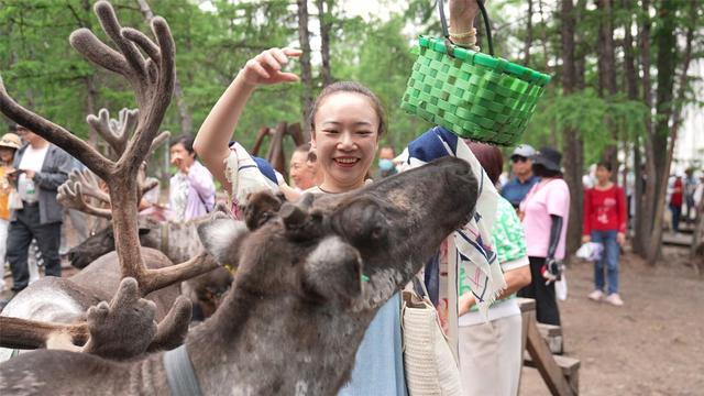 游客与驯鹿互动。