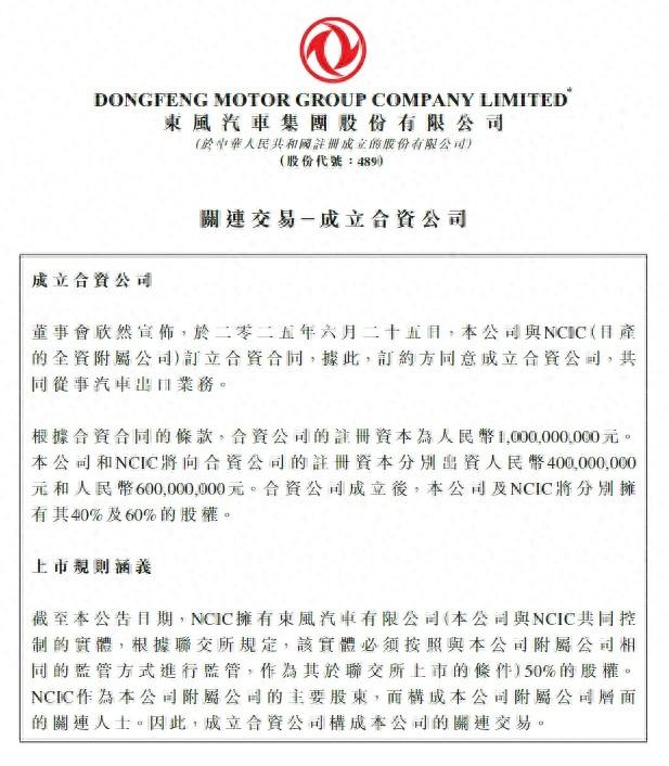 东风汽车表示,双方将合作向协商一致的海外市场出口汽车、零部件及配件,合资公司的成立将使双方于汽车出口业务发挥其财务资源及供应链能力。