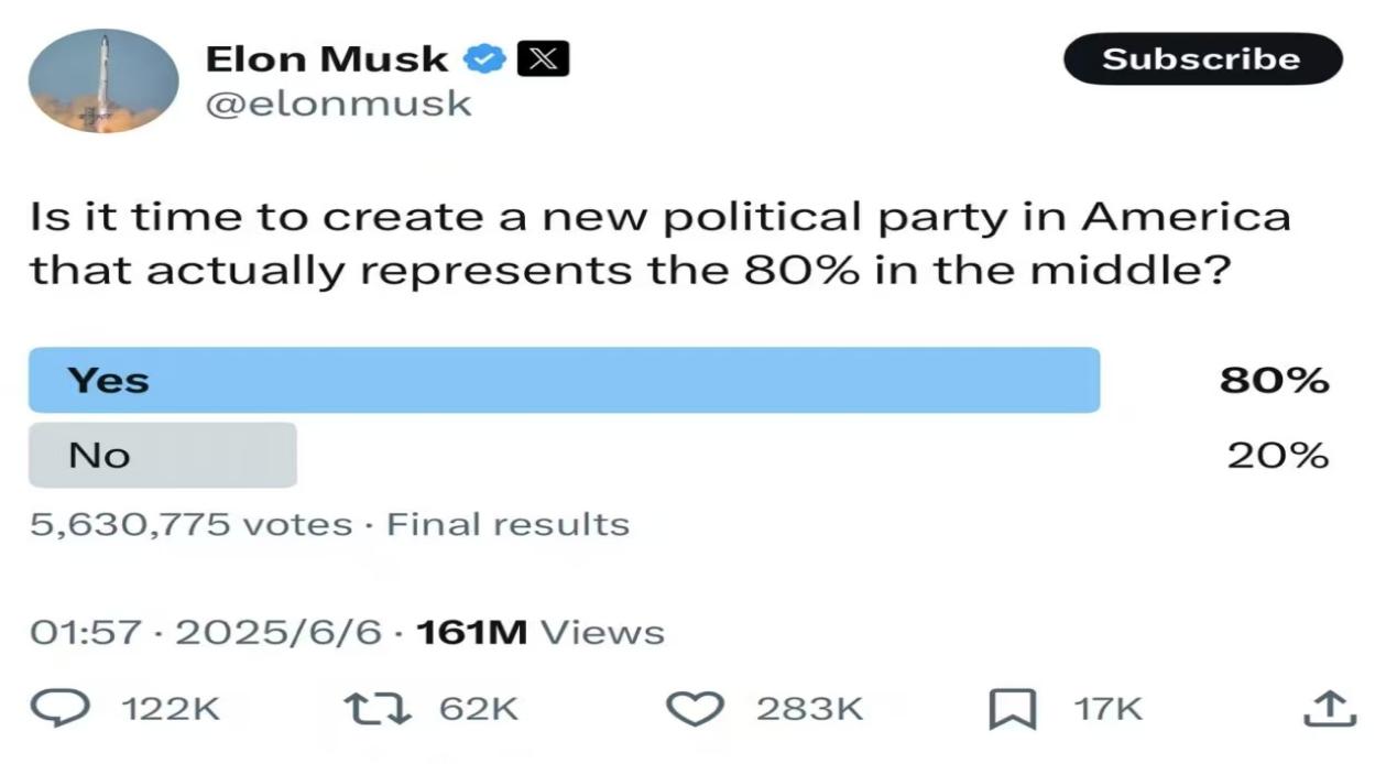 马斯克当地时间6月30日再次猛批特朗普力推的“大而美”税收和支出法案,他连发数十条帖文,称那些支持该法案的议员应该感到羞愧,并表示,如果法案通过,第二天就会成立“美国党”。马斯克曾于6月6日在社媒上发起了一项投票运动:现在是时候在美国创建一个真正代表中间80%群体的新政党了吗?投票结果显示5,630,775名用户参与投票,其中80.4%用户选择支持。