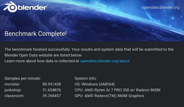 而在Blender渲染上,Radeon 860M iGPU相对于锐龙AI 7 PRO 350 CPU来说就更有优势了,实测monster、junkshop、classroom三项每分钟采样率分别为80.99、31.65以及39.26 Samples,满足基本的Blender渲染需求问题不大。