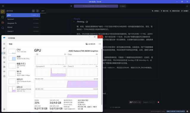总体来说,AMD锐龙AI 7 PRO 350处理器比较适合在本地运行1.5B或4B参数量的大语言模型,生成速度可以达到12.94 tok/s以及6.52 tok/s,另外7B、8B大模型也可以正常使用,但是速度相对会慢一些。