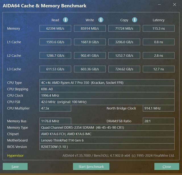 通过AIDA 64内存性能测试可以看到,32GB LPDDR5x内存读取速度为62394MB/s,写入速度为85914MB/s,拷贝速度为71724MB/s,延迟为115.3ns,整体速度还可以,对于办公而言足够用了。而且锐龙AI 7 PRO 350平台的内存延迟比较低,对于商务办公来说足够了。