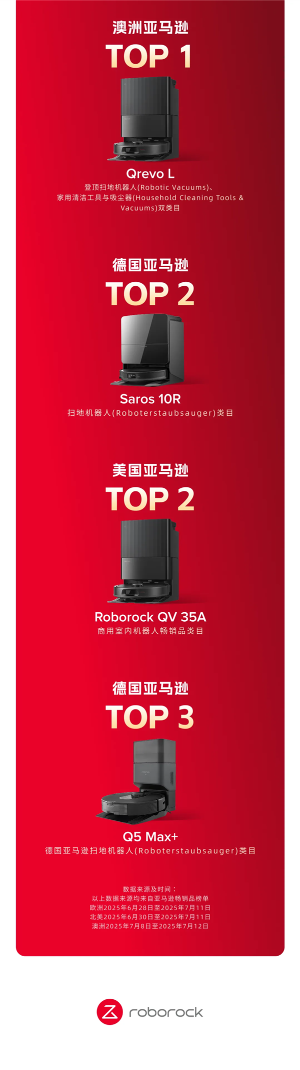 石头科技Saros 10R在德国亚马逊扫地机器人类目中的销量位居TOP2,Q5 Max+在德国亚马逊扫地机器人类目中的销量位居TOP3。
