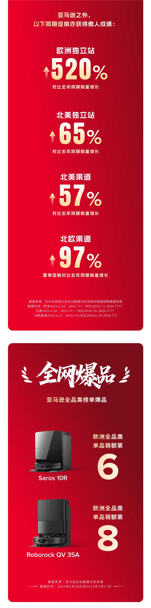 与此同时,石头海外销售业绩百花齐放:欧洲独立站销量增长520%;北美独立站销量增长65%,北欧渠道夏促销量增长97%。