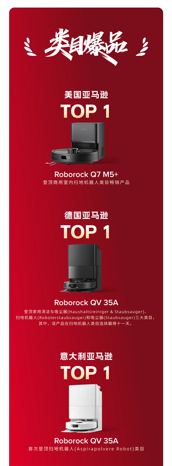 石头科技Roborock QV 35A在德国亚马逊扫地机器人类目中的销量位居TOP1,在意大利亚马逊扫地机器人类目中的销量位居TOP1,在美国亚马逊商用室内机器人畅销品类目中位居TOP2。