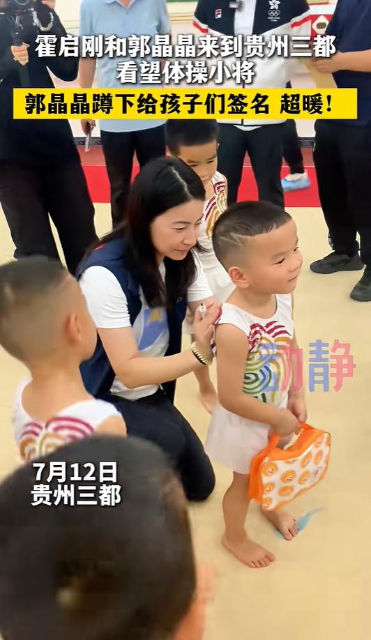 郭晶晶和霍启刚还去看望了学习体操的孩子,现场,郭晶晶蹲着为孩子们签名。