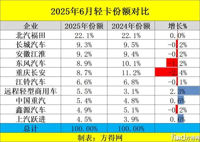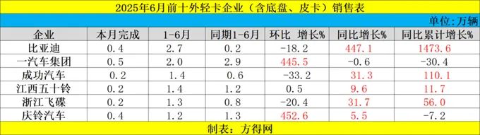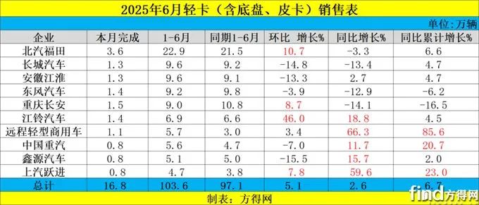 2025年6月虽不是传统旺季,但6月有6家企业实现了同比的正增长,在此背景下,哪些轻卡企业实现了超越行业的表现?