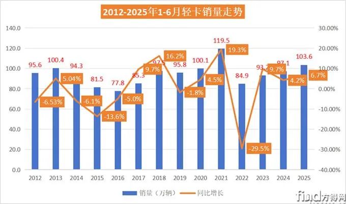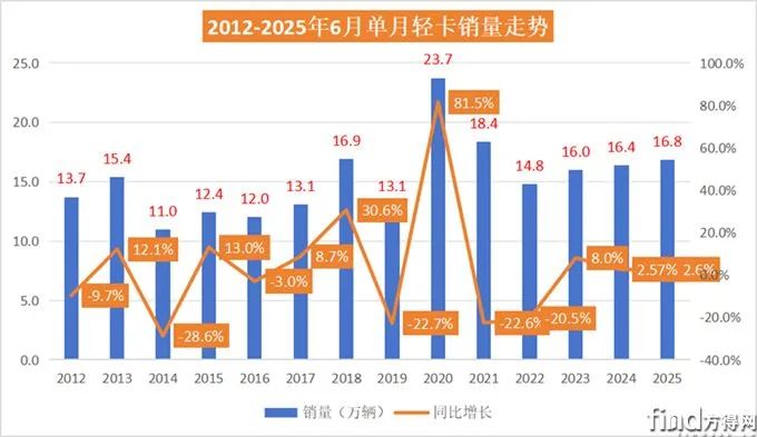 2025年6月,轻卡市场销量环比由上月-11.9%转正为5.1%,且同比增幅2.6%。