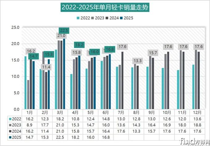 观察历年6月轻卡销量可发现,6月是传统的销售淡季,平均销量都维持在13万辆左右,2025年6月份销量在历年中为较高位。