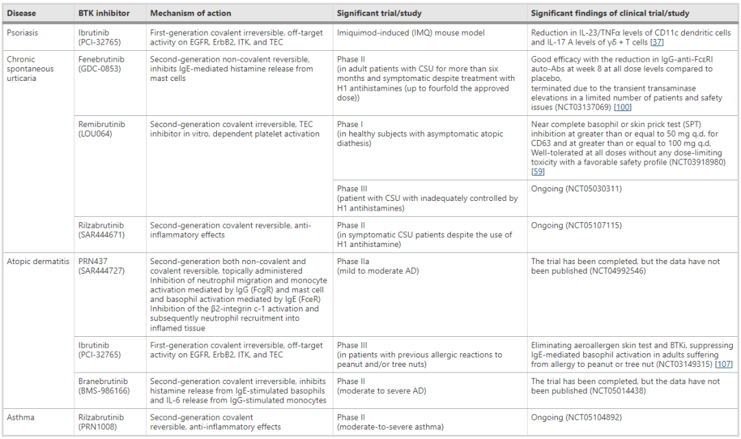 表12 在银屑病、慢性自发性荨麻疹、特应性皮炎和哮喘的的BTKIs
