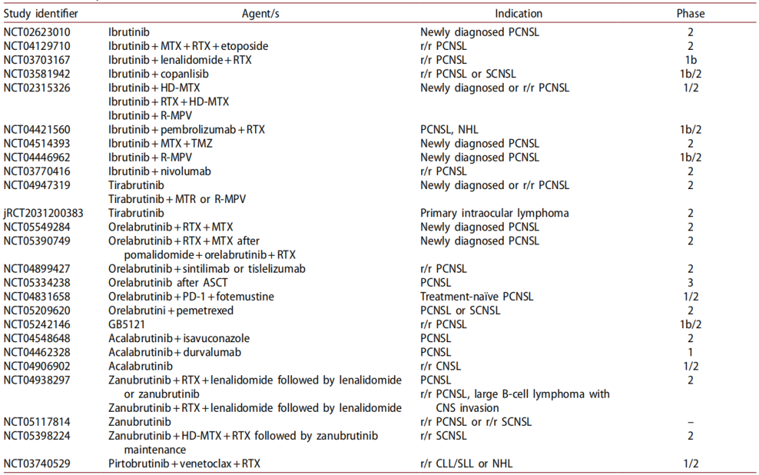 Schaff L, Nayak L, Grommes C. Bruton's tyrosine kinase (BTK) inhibitors for the treatment of primary central nervous system lymphoma (PCNSL): current progress and latest advances. Leuk Lymphoma. 2024 Jul;65(7):882-894.