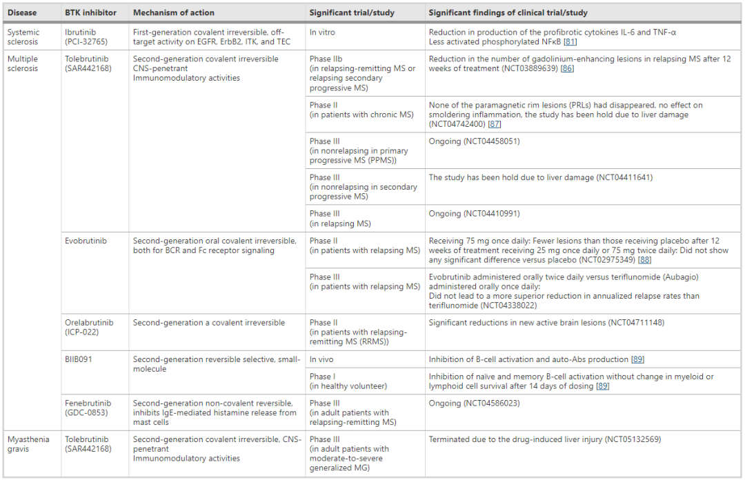 表11 在多发性硬化症和重症肌无力的临床前和临床试验中测试的BTKIs