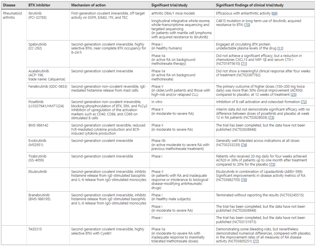 表9 类风湿性关节炎临床前和临床试验中测试的BTKIs