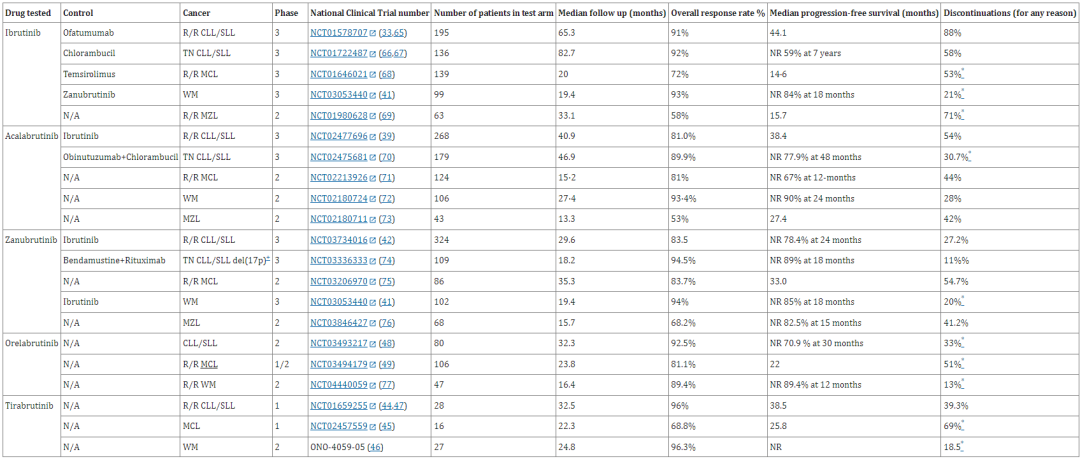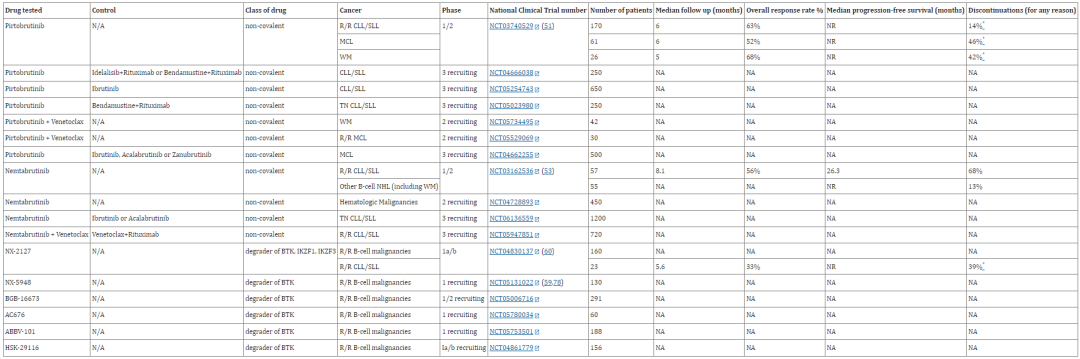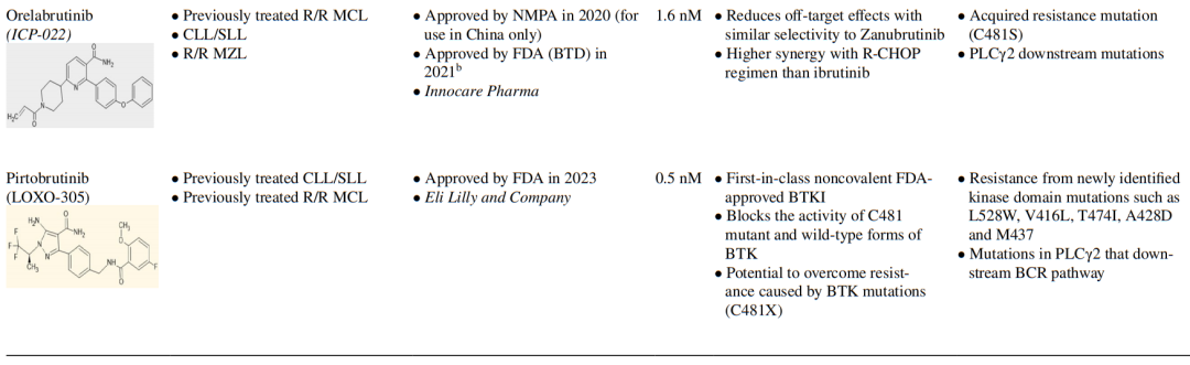 表5 已发表的针对CLL/SLL、MCL、WM、MZL的共价BTKIs