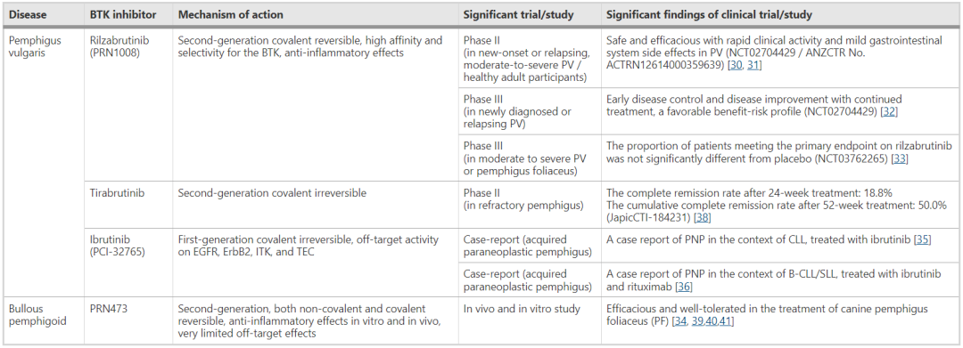表7 自身免疫性水疱病临床前和临床试验中测试的BTKIs