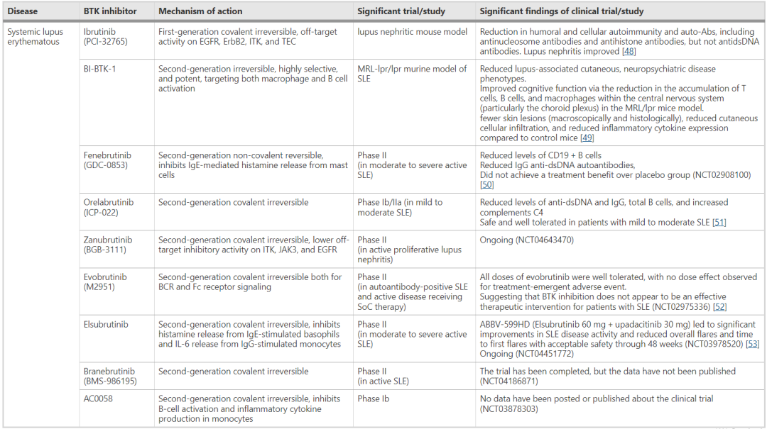 表8 系统性红斑狼疮临床前和临床试验中测试的BTKIs
