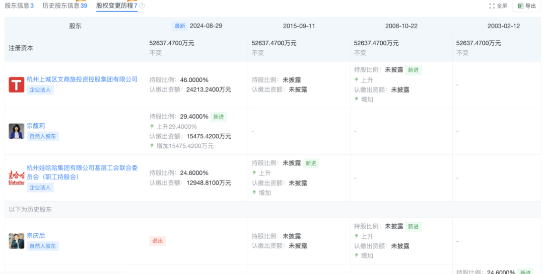 同时,宗庆后退出股东行列,杭州娃哈哈集团有限公司由宗馥莉、杭州上城区文商旅投资控股集团有限公司、杭州娃哈哈集团有限公司基层工会联合委员会(职工持股会)3名股东共同持股。其中,宗馥莉持股比例为29.4%。