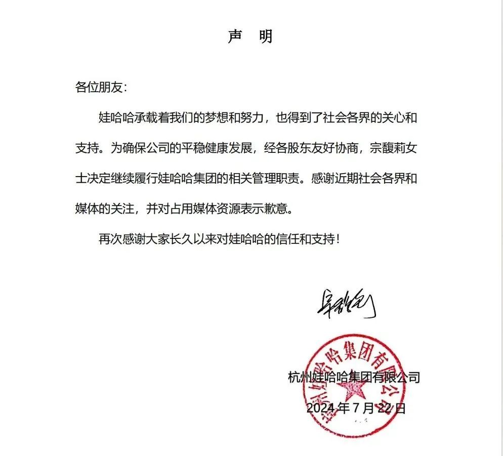 2024年7月,一封关于宗馥莉的辞职信疯传,称宗馥莉对娃哈哈集团的经营管理被股东等质疑。5天后,娃哈哈集团发表声明,称宗馥莉继续履行娃哈哈集团相关管理职责。