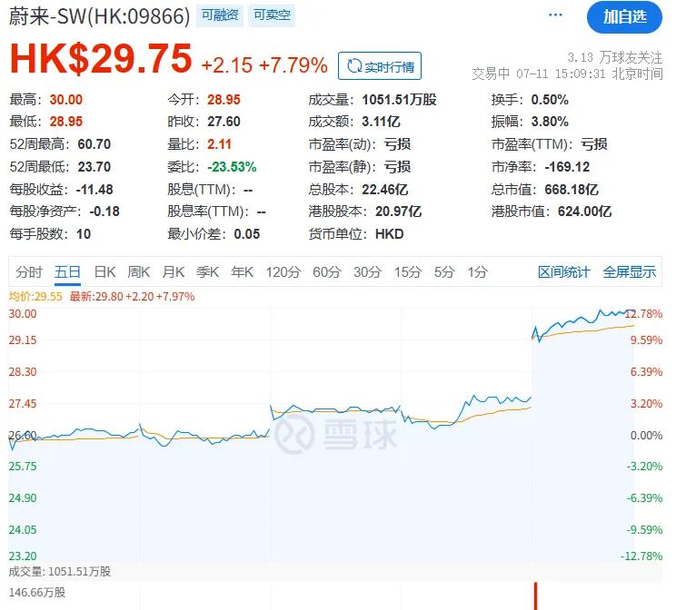 此前蔚来已连续多个交易日上涨。7月11日,蔚来港股(09866.HK)大涨达7.79%。