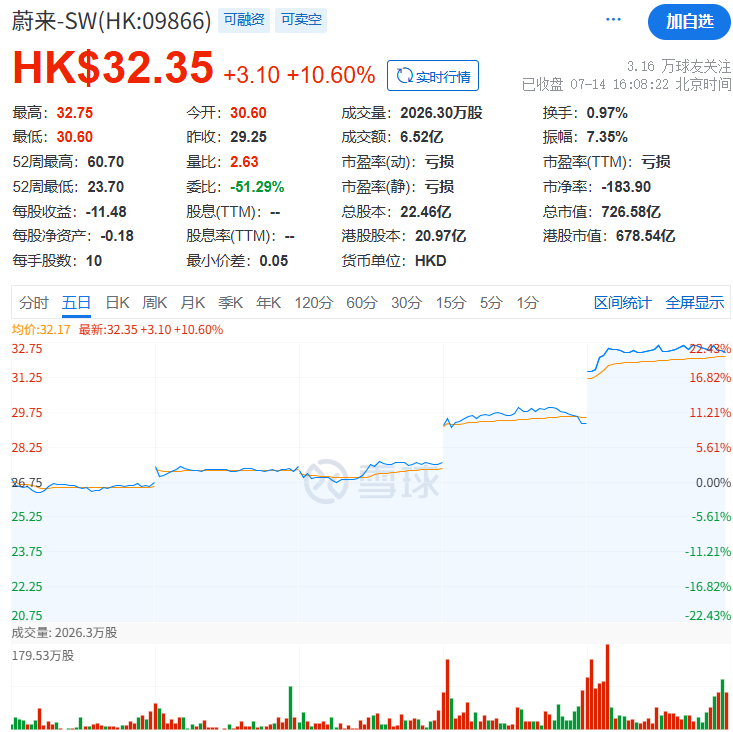电动知家消息,7月14日,蔚来汽车港股市场表现非常亮眼,再次暴涨10.6%。