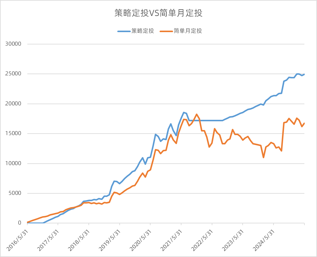 简单月定投为:每月月底定投固定金额,使总金额和策略定投累计投入金额一致。